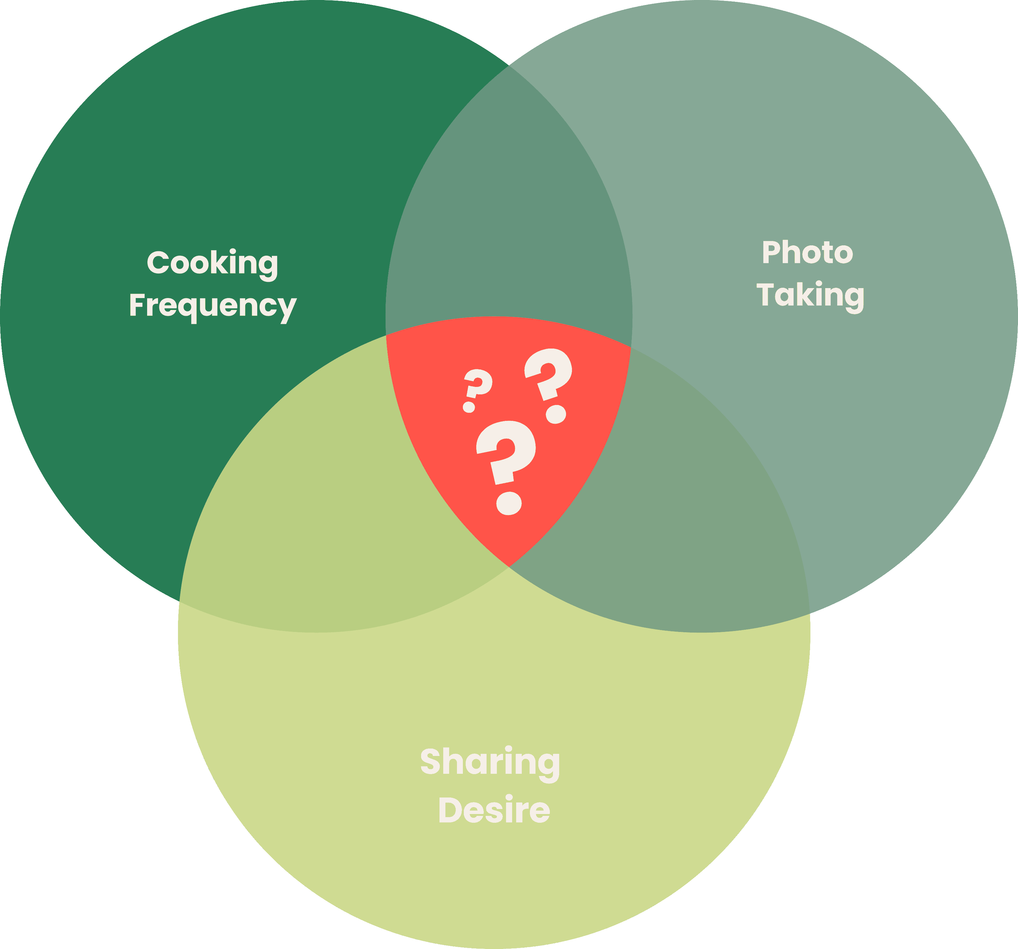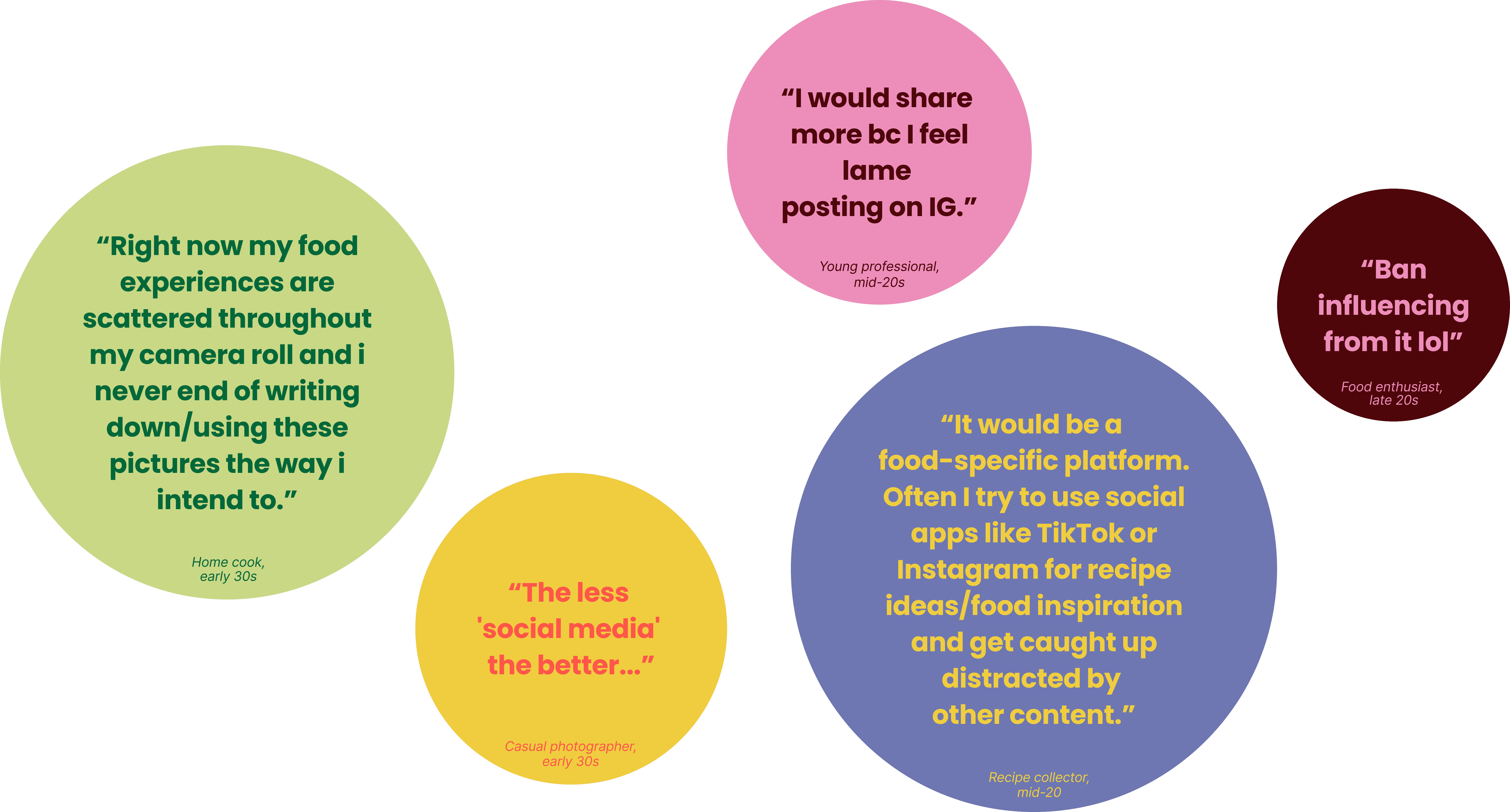 Through surveys with 21 regular home cooks (ages 25-35), clear patterns emerged about how people want to share food memories. These voices revealed a clear gap: people want to document and share food moments, but existing platforms feel performative, overwhelming, and misaligned with their actual needs. The desire for organization without pressure. Connection without performance. Memory without metrics.